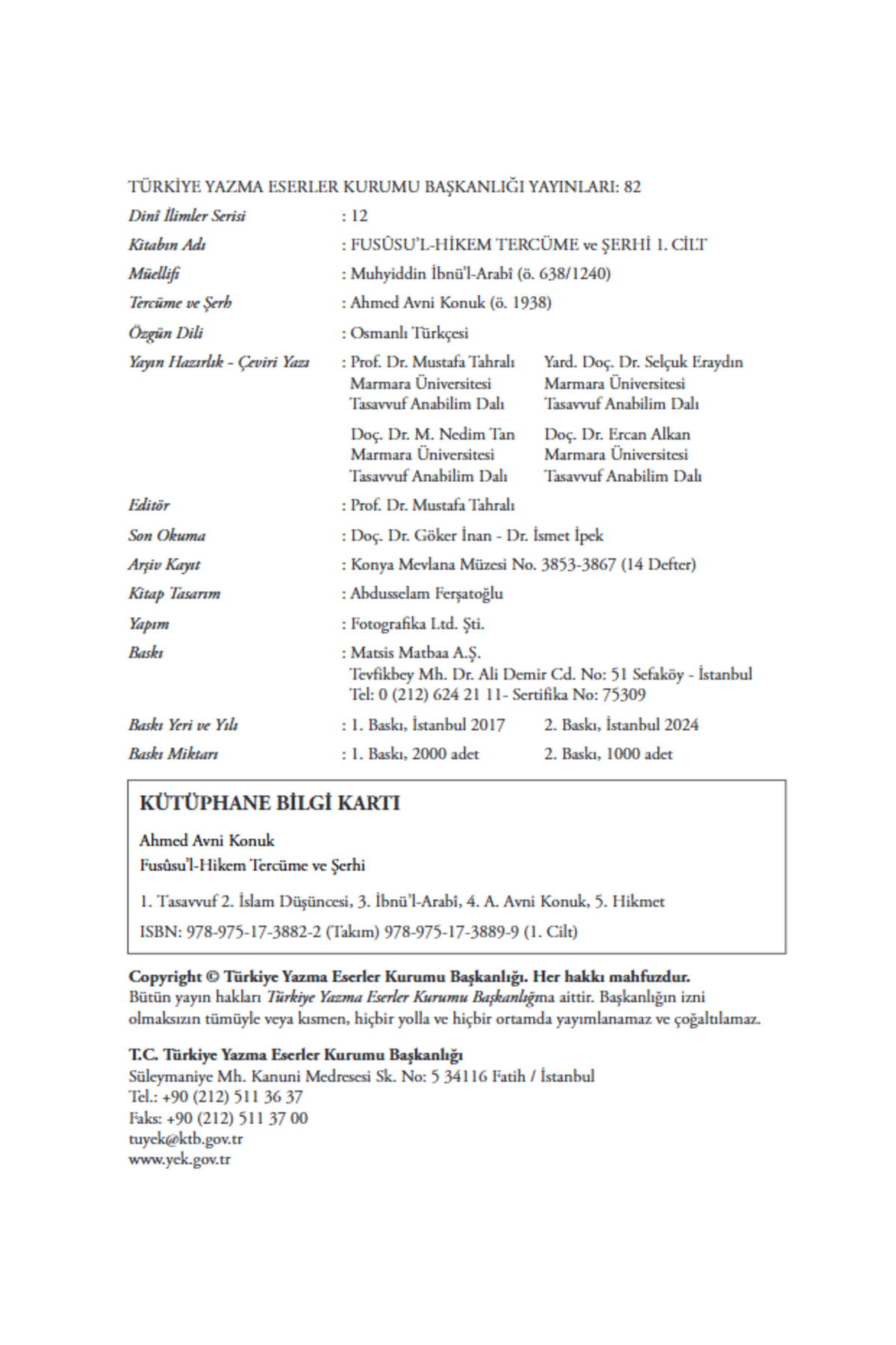 TÜRKİYE YAZMA ESERLER KURUMU BAŞKANLIĞI YAYINLARI Fusûsu’l-hikem Tercüme Ve Şerhi (1-2 Cilt Takım)