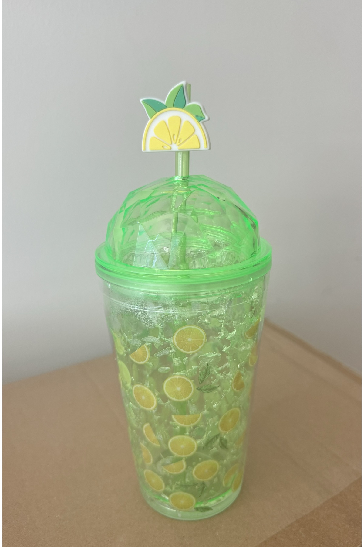 Two Two Limonlu Renkli Yaz Desenli Pipetli İçecek Kupası 101-Yeşil Sarı