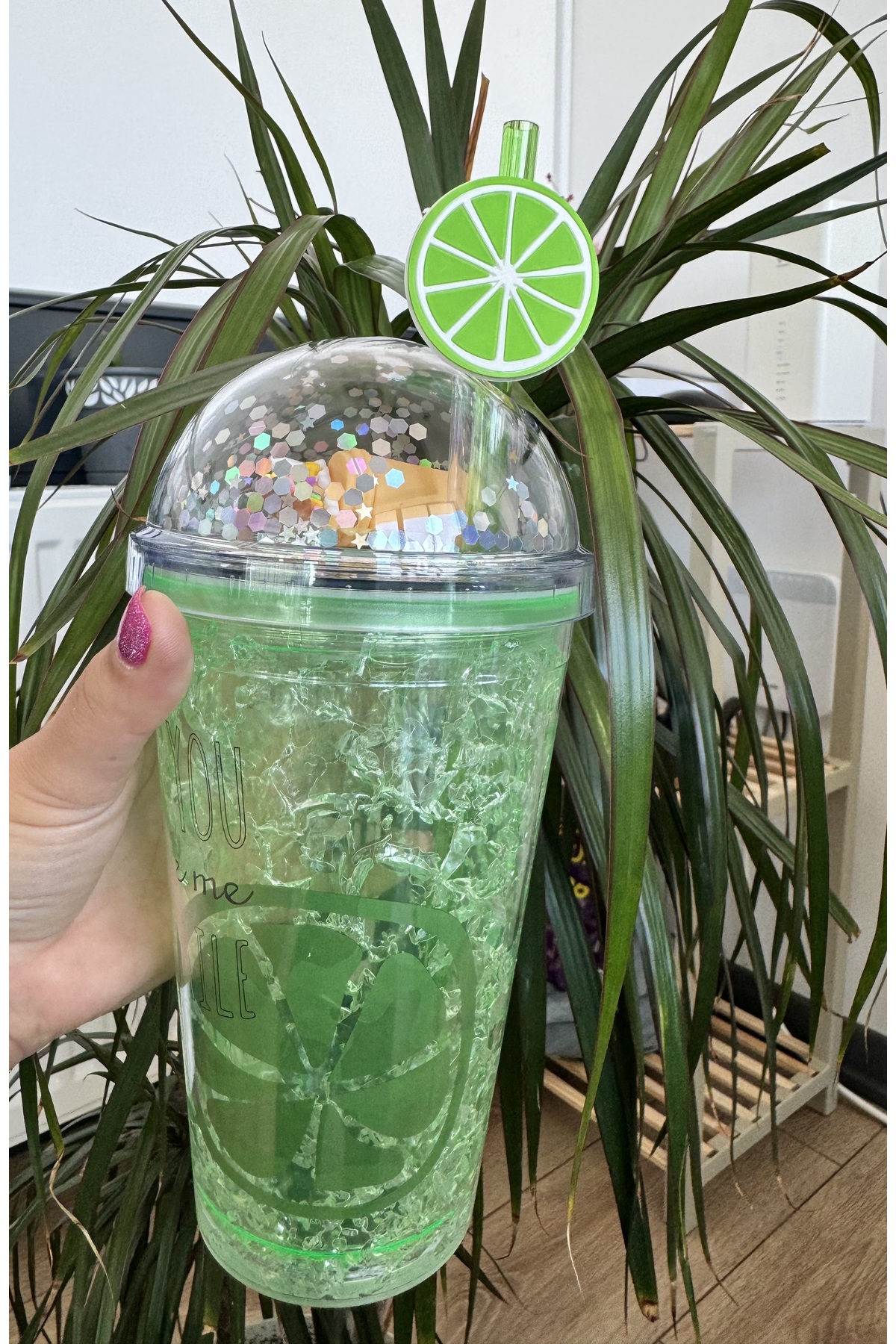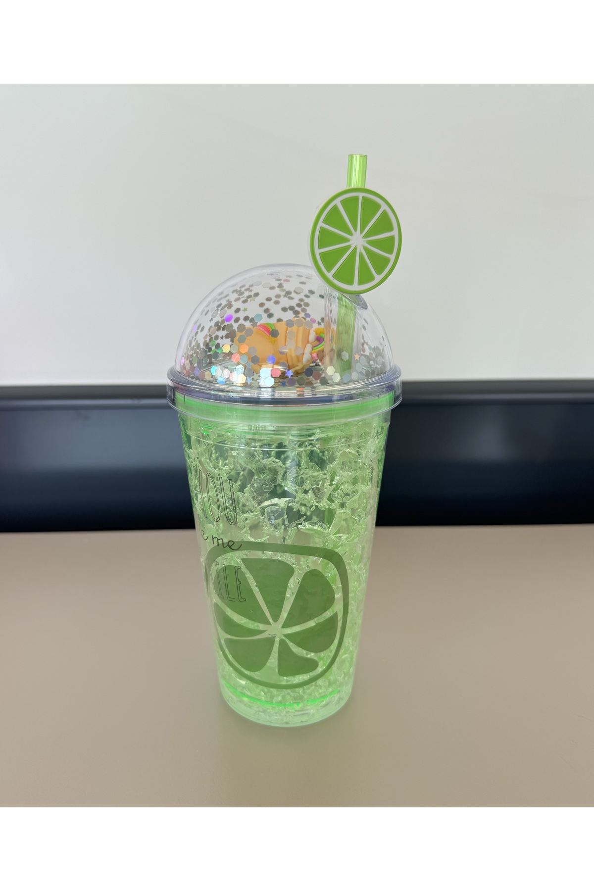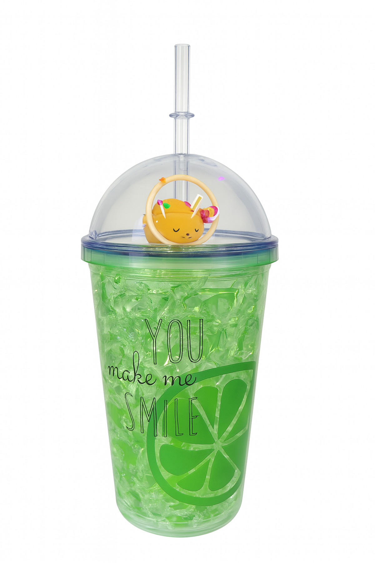 Two Two Renkli Yaz Desenli Pipetli İçecek Kupası-Yeşil Limon desenli pipetli bardak
