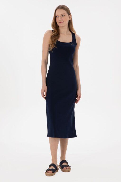 U.S. Polo Assn. Kadın Lacivert Yırtmaçlı Kolsuz Kare Yaka Midi Boy Örme Elbise 50305835-vr033