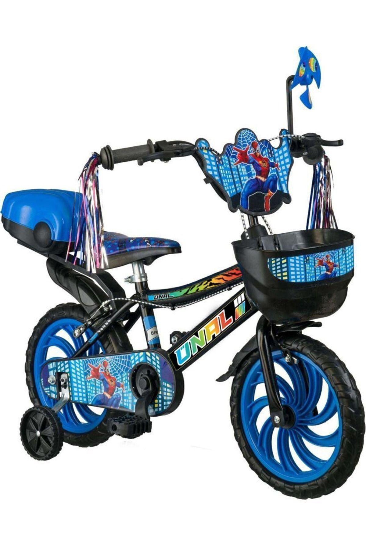 Joymax Erkek Çocuk Bisikleti 16 jant Mavi – Led Işıklı Örümcek a. Figürlü Çantalı,Püsküllü