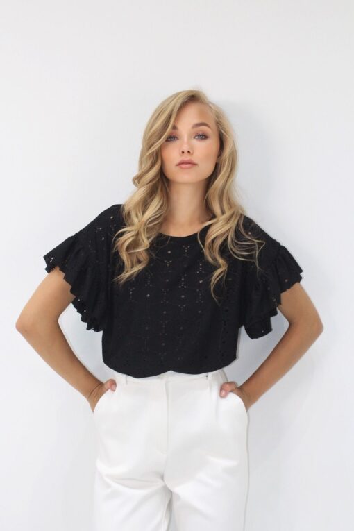 VAGGON Kadın Siyah Bisiklet Yaka Delik Ajurlu Kolları Fırfırlı Örme Bluz Vs00279 ürünü ucuz fiyat, hızlı kargo ve kredi kartına 12 ay taksit imkanı ile hemen sitemizden sipariş verin.