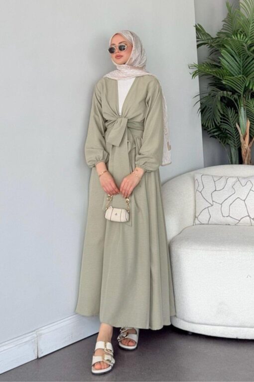 HİJABAYA Önü Bağcıklı Beli Lastikli Etekli Keten Takım