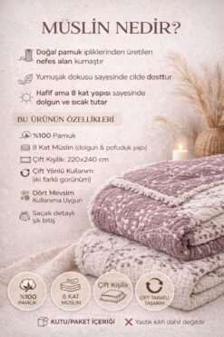 VERONİCA LİNE Premium Geometrik Kare Desenli %100 Pamuk Müslin Çift Taraflı Yatak Örtüsü Pike 220×240 Çift Kişilik
