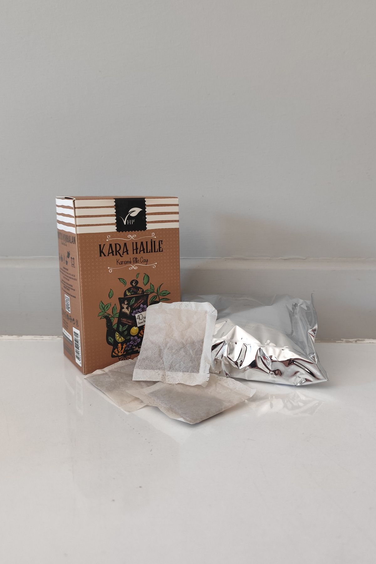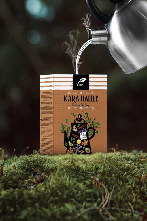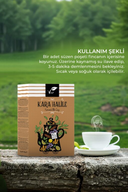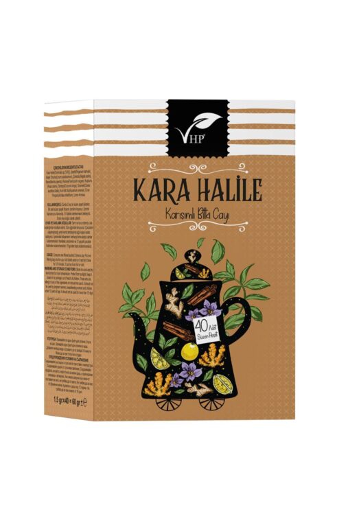 VHP KARA HALİLELİ ÇAY İçerik: Kara halile(terminalia sp.), üzerlik(peganum harmala),nane(mentha piperita), yavşan otu(veronica beccabunga),kuşburnu(rosa canina), kırkkilit(equisetum arvense), zerdeçal(curcuma longa), keten tohumu(linum usitatissimum),çörek otu(nigella sativa), civan perçemi(achillea millefolium) ve rezene(foeniculum vulgare) ile zenginleştirilmiş güçlü bir içeriğe sahiptir. VHP Kara Halileli Çayın içerisindeki önemli bitkiler doğal yöntemler ile kurutularak özelliğini kaybetmeden 40 adet doğa dostu poşetler ile sunulmaktadır. Kullanımı ve Muhafaza Şartları: Bir adet poşeti bir fincanın içine koyun. Üzerine kaynamış su ilave edin. 3-5 dakika demlenmesini bekleyin. Sıcak veya soğuk olarak içilebilir. Bitki çaylarının tatlandırmadan kullanılması tavsiye edilir. Gerektiğinde bal ile tatlandırılabilir. Uyarılar: Serin ve kuru ortamda saklayınız. Gün ışığına karşı koruyunuz. İlaç değildir. Ürünlerin içeriğinde hiçbir şekilde katkı maddesi, koruyucu ve renklendirici bulunmamaktadır. Türk Gıda Kodeksine Uygun Olarak Üretilmiştir. İşletme Kayıt No: TR-34-K-030262 İlgili yasa ve yönetmelikler gereği bitkisel destek ürünleri ile ilgili, hastalık adı veya endikasyon belirterek tanıtım yapılmamaktadır. Ürünlerimiz ilaç değil