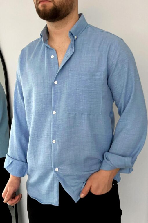 VİP LOKAL Bebe Mavi Tek Cep Keten Gömlek