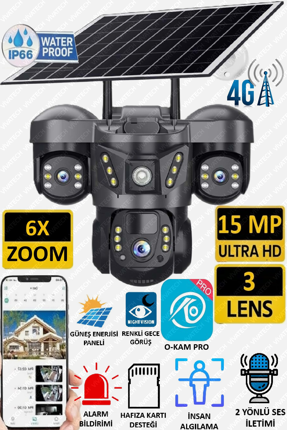 VİVATECH Ultimate 7070 Solar Güneş Enerjili İnsan Takibi 15MP 3 Lens 4G Akıllı Kamera Okam Pro Uygulama ürünü ucuz fiyat, hızlı kargo imkanı ile hemen sitemizden sipariş verin.