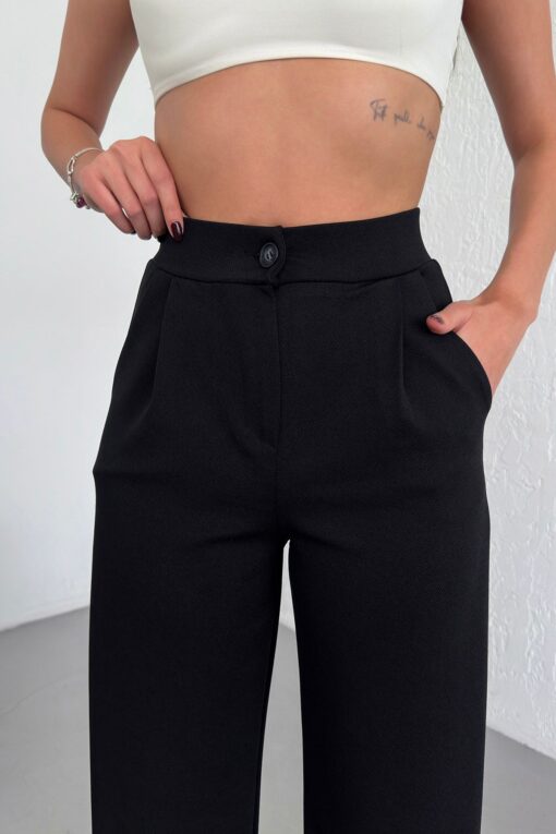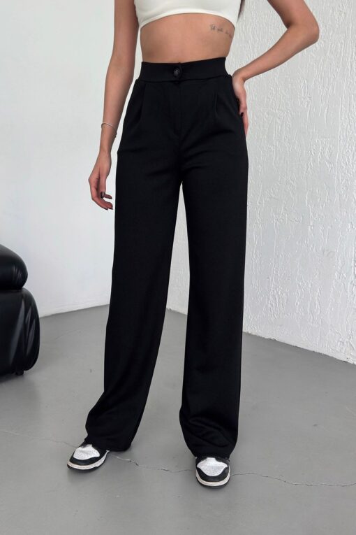 Warasiva Kadın Siyah Yüksek Bel Pileli Düğmeli Likralı Esnek Rahat Kalıp Palazzo Pantolon