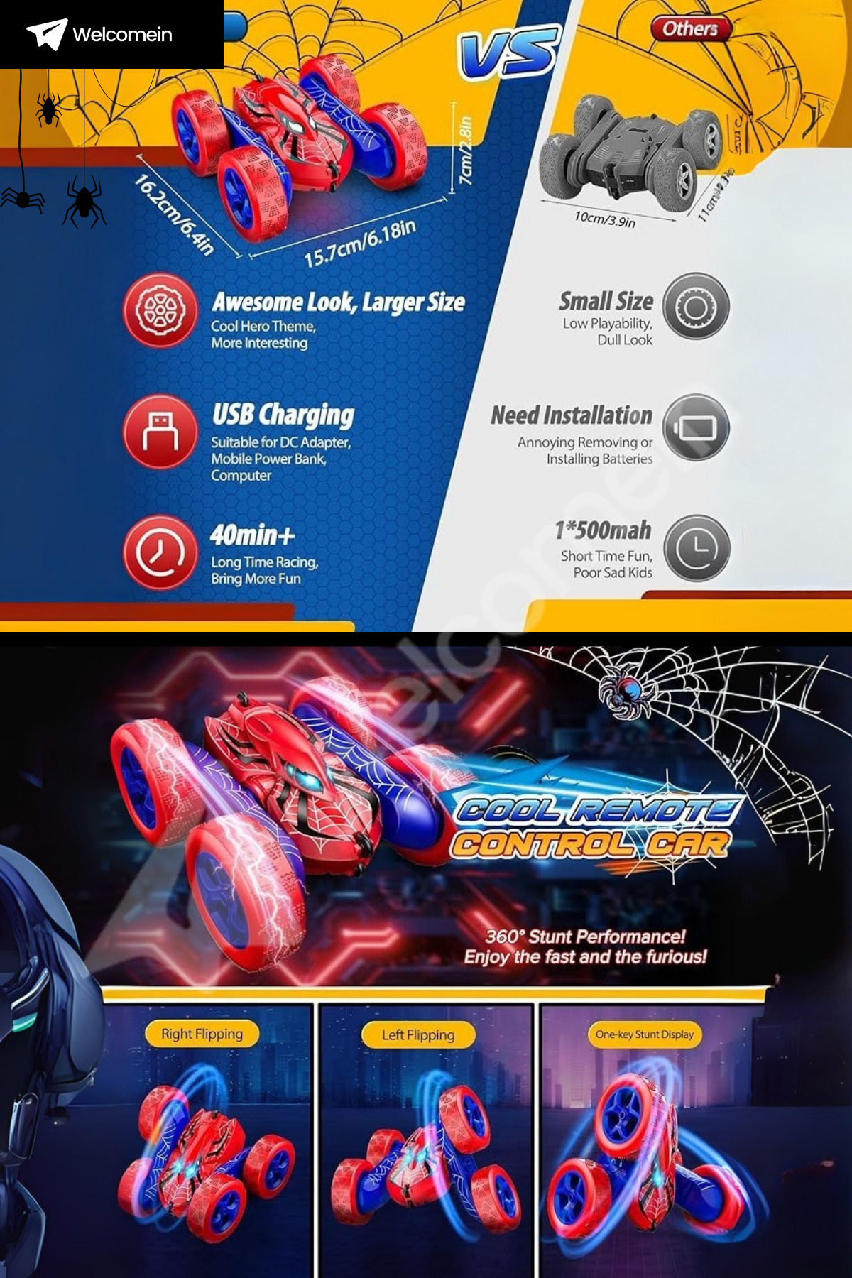 welcomein 360° Dönen Buhar Atan Şarjlı 2.4GHz Akrobat RC Araba Örümcek Adam Venom Uğur Böceği Akrobatik en ucuz fiyata kozmetikara.com sitemizden sipariş verebilirsiniz.