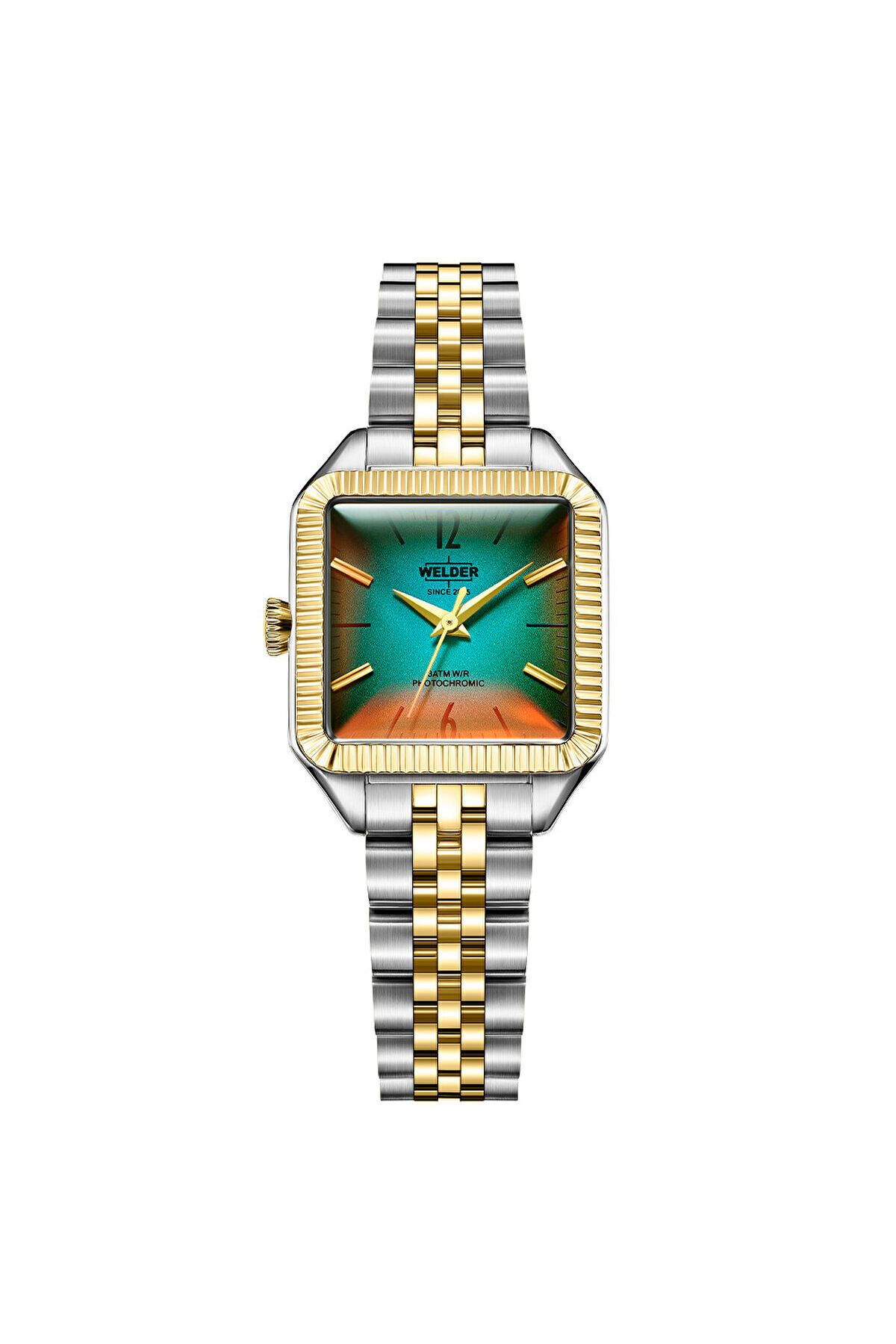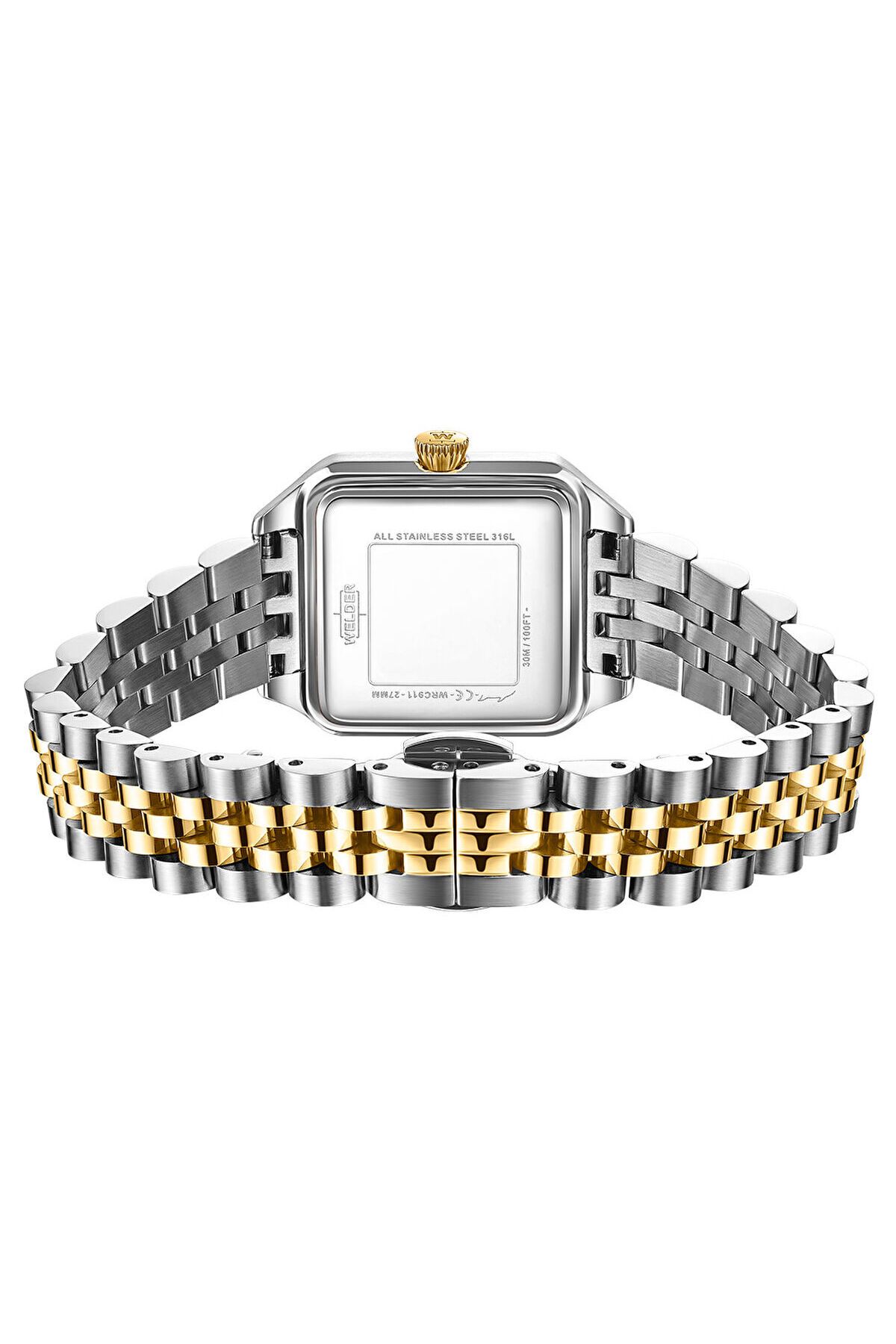 CaseDiameter:27 mm WaterProof:3 ATM CaseThickness:9 mm StrapLanyardColor:Altın Rengi/Metalik Gri DialType:Analog StrapLanyardProperty:Çelik Gender:Kadın Yaş Grubu:Kadın CategoryName:Kadın Klasik Saat CaseShape:Kare Style:Klasik Saatler CaseColor:Metalik Gri GlassProperty:Mineral Photochromic Technology:Quartz BrandName:Welder CaseStone:Yok Alarm:Yok DialStone:Yok