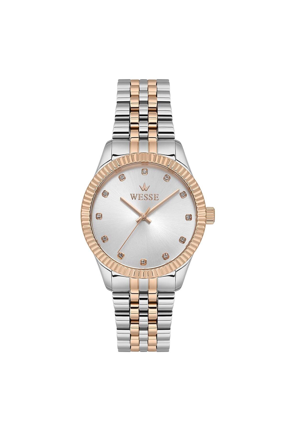 CaseDiameter:36 mm WaterProof:5 ATM CaseThickness:9 mm DialType:Analog KasaMateryali:Çelik StrapLanyardProperty:Çelik DialColor:Gümüş Tonu Gender:Kadın Yaş Grubu:Kadın CategoryName:Kadın Klasik Saat Style:Klasik Saatler CaseColor:Metalik Gri StrapLanyardColor:Metalik Gri/Rose Gold GlassProperty:Mineral Technology:Quartz KadranTasi:Var BrandName:Wesse Calendar:Yok Kronometre:Yok CaseStone:Yok Alarm:Yok DialStone:Yok CaseShape:Yuvarlak