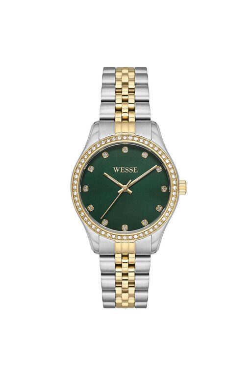 CaseDiameter:34 mm WaterProof:5 ATM CaseThickness:8 mm Style:Abiye Saatler StrapLanyardColor:Altın Rengi/Metalik Gri DialType:Analog KasaMateryali:Çelik StrapLanyardProperty:Çelik Yaş Grubu:Kadın Gender:Kadın CategoryName:Kadın Abiye Saat CaseColor:Metalik Gri GlassProperty:Mineral Technology:Quartz KadranTasi:Var CaseStone:Var DialStone:Var BrandName:Wesse DialColor:Yeşil Calendar:Yok Kronometre:Yok Alarm:Yok CaseShape:Yuvarlak