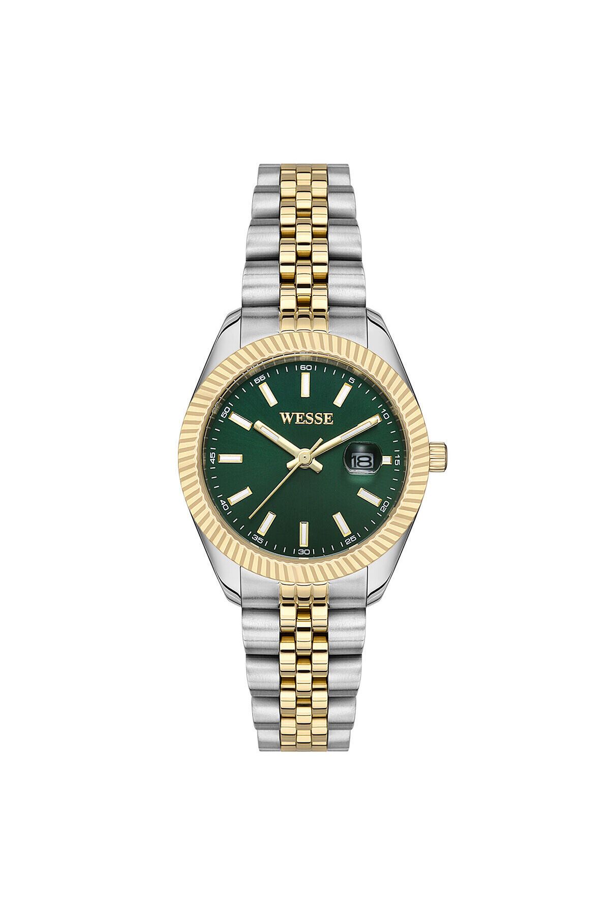 Ağırlık: 74 gr CaseDiameter:32 mm WaterProof:5 ATM CaseThickness:9 mm StrapLanyardColor:Altın Rengi/Metalik Gri DialType:Analog KasaMateryali:Çelik StrapLanyardProperty:Çelik Yaş Grubu:Kadın Gender:Kadın CategoryName:Kadın Klasik Saat Style:Klasik Saatler CaseColor:Metalik Gri GlassProperty:Mineral Technology:Quartz Calendar:Var BrandName:Wesse DialColor:Yeşil Kronometre:Yok KadranTasi:Yok CaseStone:Yok Alarm:Yok DialStone:Yok CaseShape:Yuvarlak