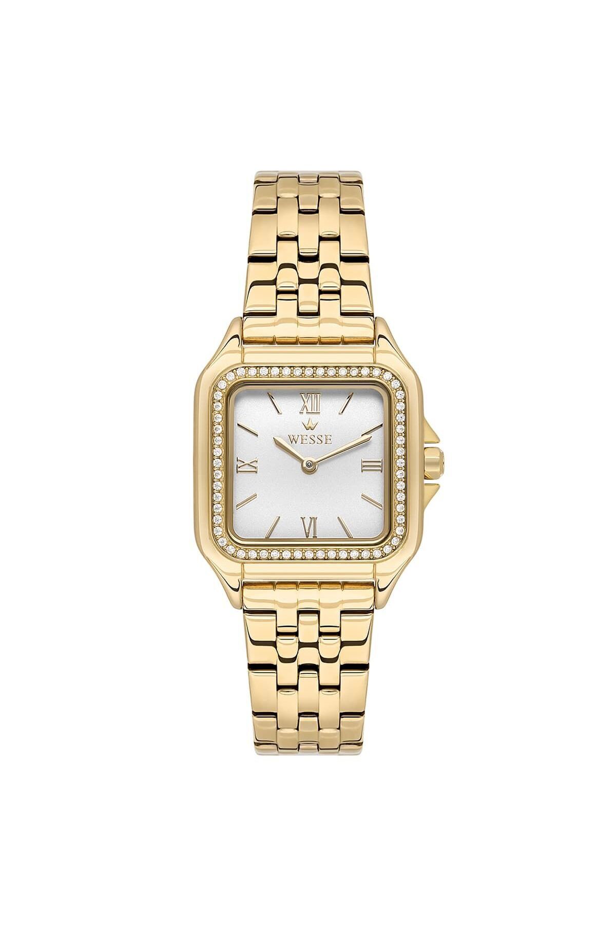 CaseDiameter:27.5 mm WaterProof:3 ATM CaseThickness:7 mm StrapLanyardColor:Altın Rengi CaseColor:Altın Rengi DialType:Analog StrapLanyardProperty:Çelik KasaMateryali:Çelik DialColor:Gümüş Tonu Kronometre:Hayır Yaş Grubu:Kadın Gender:Kadın CategoryName:Kadın Klasik Saat Style:Klasik Saatler GlassProperty:Mineral Technology:Quartz DialStone:Var CaseStone:Var BrandName:Wesse Alarm:Yok KadranTasi:Yok Calendar:Yok CaseShape:Yuvarlak