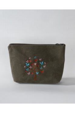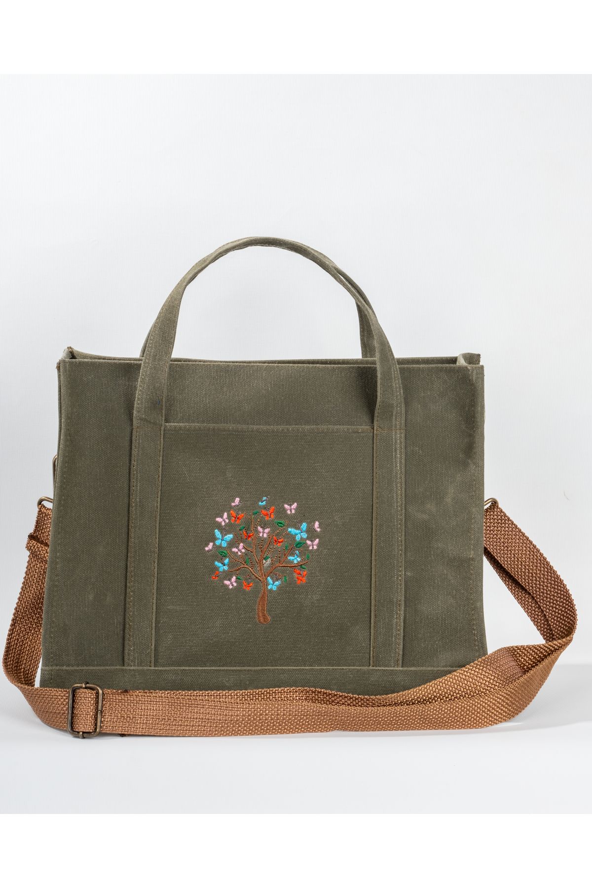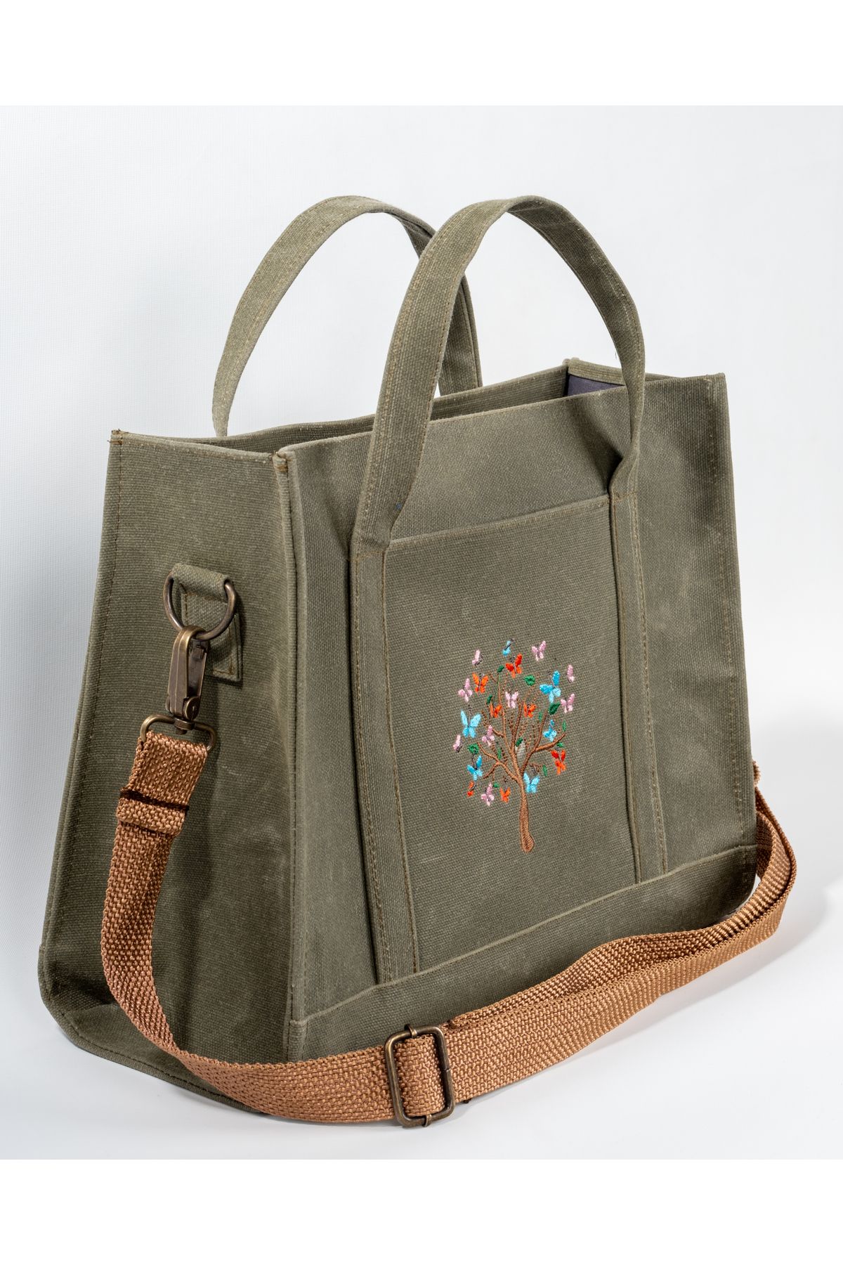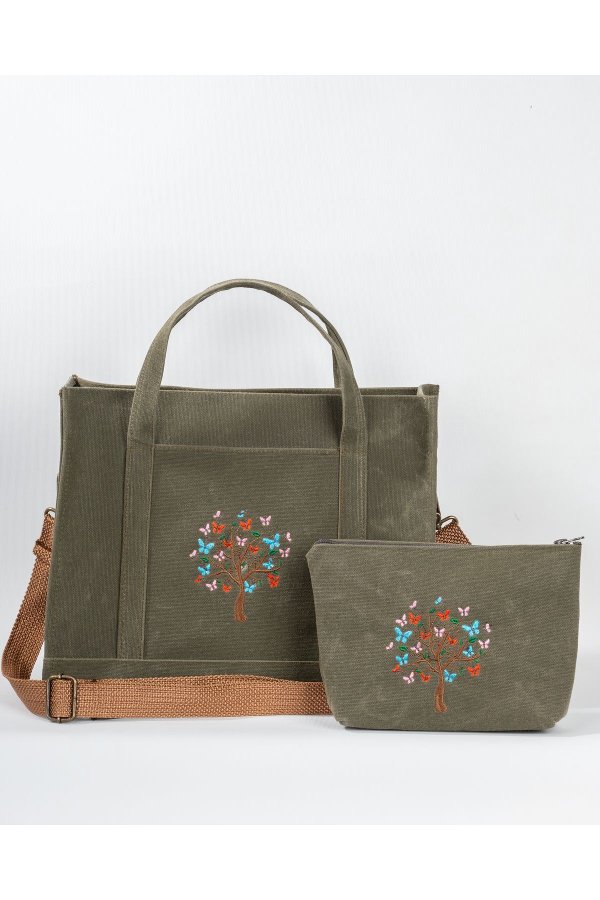 Wings Of Simurg Butikmutik-Büyük Boy Kelebek AĞACI Nakışlı Haki Mumlu Kanvas TAKIM (Çanta ve Cüzdan)