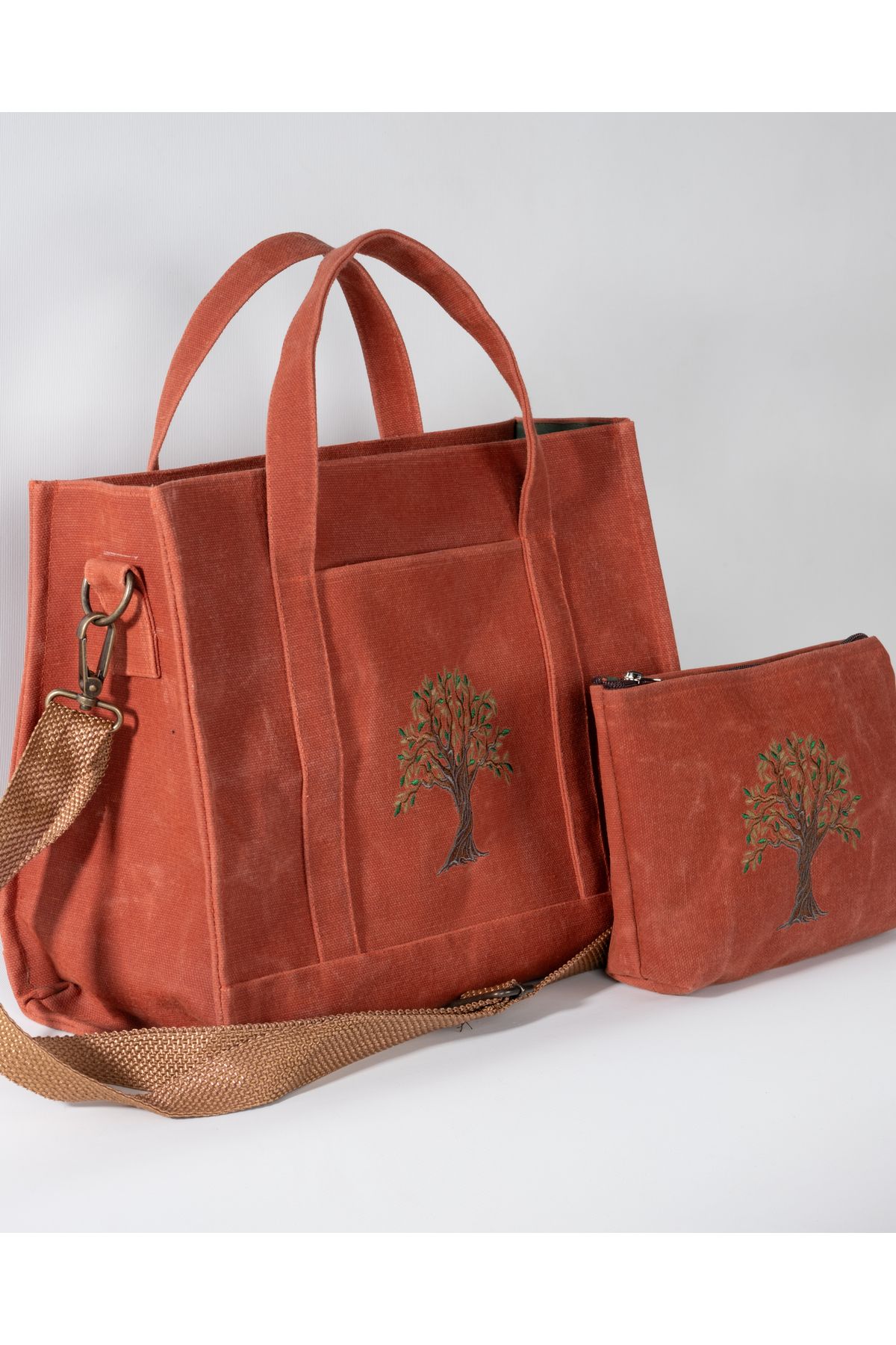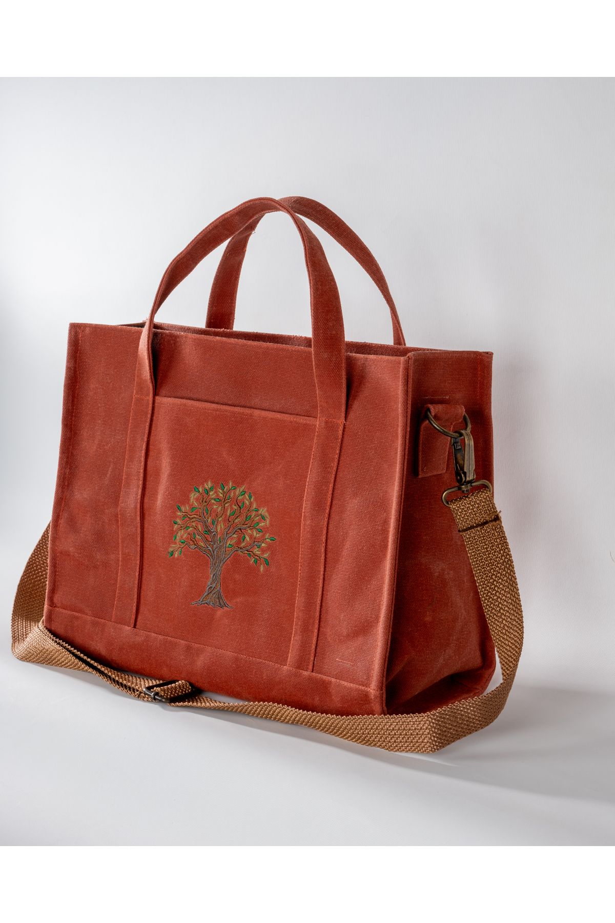 Wings Of Simurg Butikmutik-Büyük Boy ZEYTİN AĞACI Nakışlı (Kiremit) Mumlu Kanvas TAKIM (Çanta ve Cüzdan)