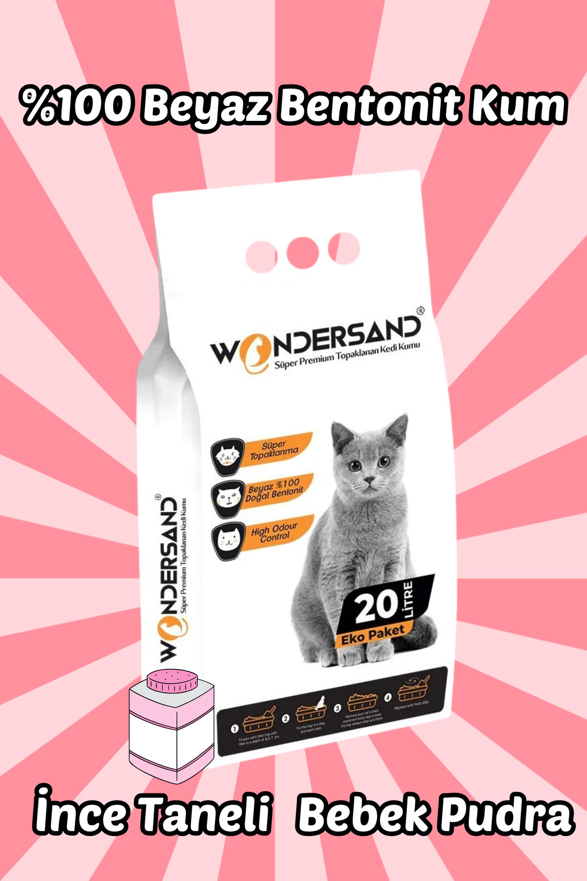 wondersand 20 Litre %100 Beyaz Bentonit Ince Tane Bebek Pudra Kokulu Topaklanan Premium Kedi Kumu ürünü ucuz fiyat, hızlı kargo imkanı ile hemen sitemizden sipariş verin.