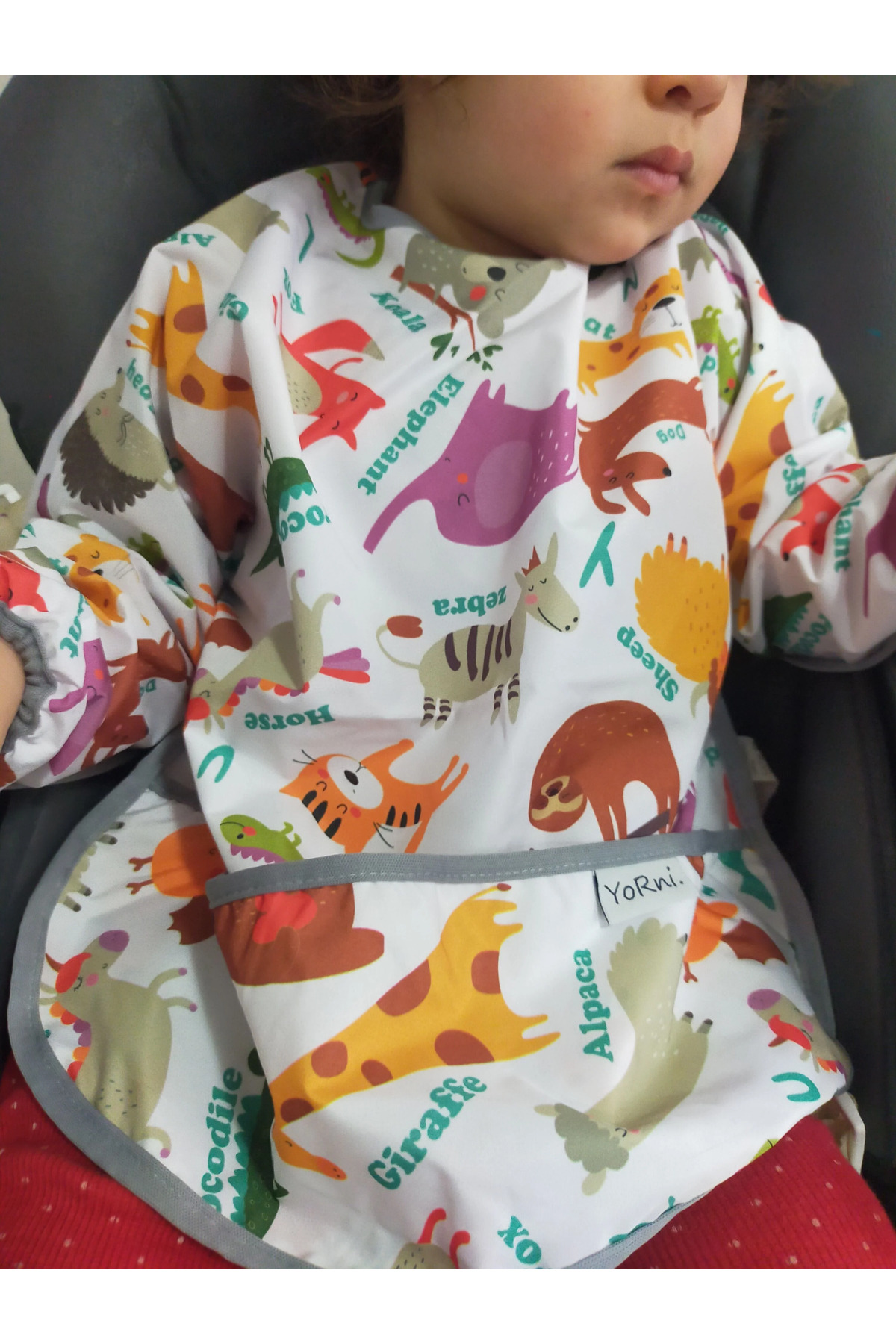 yorni 2-4yaş, Zoo, Sıvı Geçirmez, Makinede Yıkanabilir, Cepli, Uzun Kollu Bebek Mama Önlüğü, Önlük