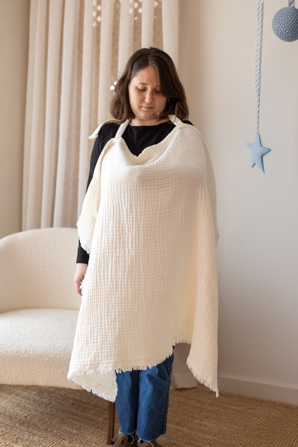 ZEYPBA Ekru 4 Katlı Müslin Emzirme Örtüsü & Puset Örtüsü Püsküllü 90x110cm