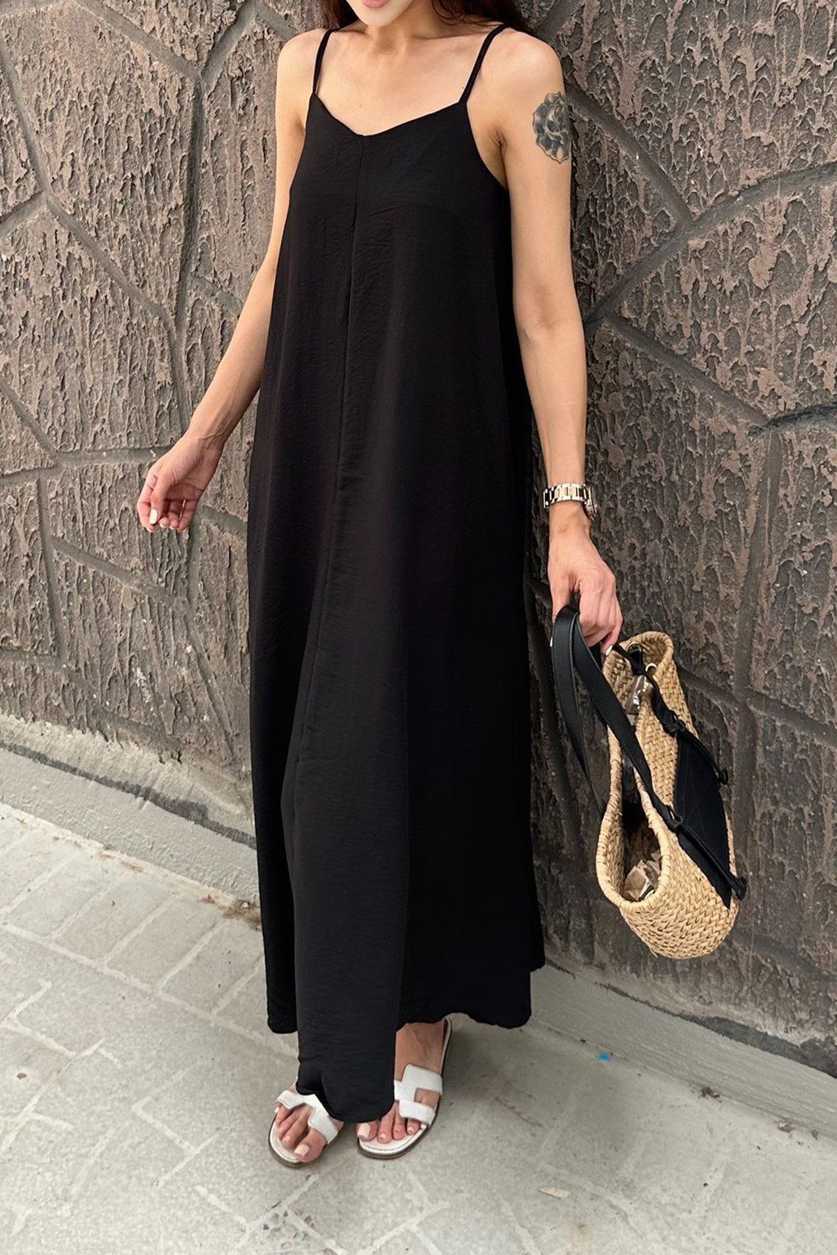 Zikuv Ayarlanabilir Askılı Midi Boy Siyah Full Likralı Elbise