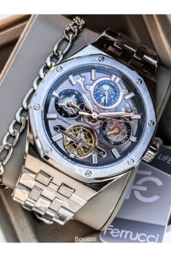 Ferrucci Otomatik Pilsiz, Çelik Kordon,Fonksiyonlu,Füme Renk,Gerçek Dış Çekim Erkek Kol Saati+Bileklik