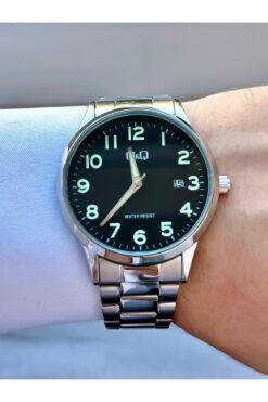 Q&Q Erkek Gümüş Rakamlı Siyah Kadran Tarih Göstergeli Analog Saat