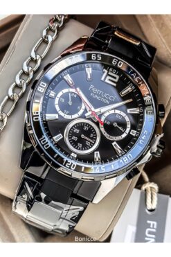 Ferrucci Erkek Kol Saati, Takvimli Fonksiyonları Aktif, Siyah Çelik Kordon, Siyah Kadran + Bileklik