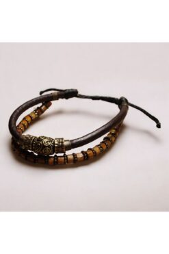 DEHNA Antik Desenli Metal Figürlü Kahverengi Deri Ve Ahşap Boncuklu Iki Parça Bileklik