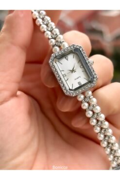 Bonicce Özel Hediyelik Kutuda Retro Model,minimal Dikdörtgen,gümüş Renk Kordon,incili Kadın Kolsaati