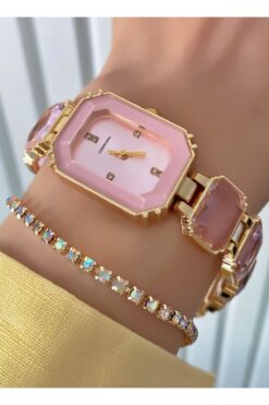 Merand Kadın Kol Saati – Altın Kaplama, Pembe Taşlı Zarif Tasarım – Hediye Bileklik