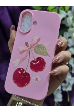 Magic Ring iPhone 16 Uyumlu Kiraz ve Kurdele Desenli İçi Kadife Sert Silikon Pembe Telefon Kılıfı