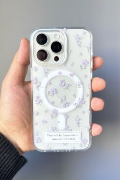 KVK PRİVACY Iphone 16 Pro Kılıf Mor Çiçek Desenli Magsafe Şeffaf Kılıf Darbeye Dayanıklı Kapak