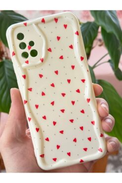 Fibaks Samsung Galaxy A51 Kılıf Kamera Korumalı Dalga Kenarlı Kırmızı Kalp Desenli Silikon Kapak