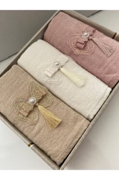 AYHANHOME 3’lü Fiyonklu Püsküllü Kutulu Çeyizlik 50×90 Kadife El Ve Yüz Havlusu
